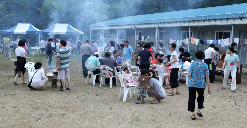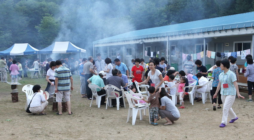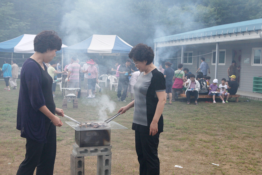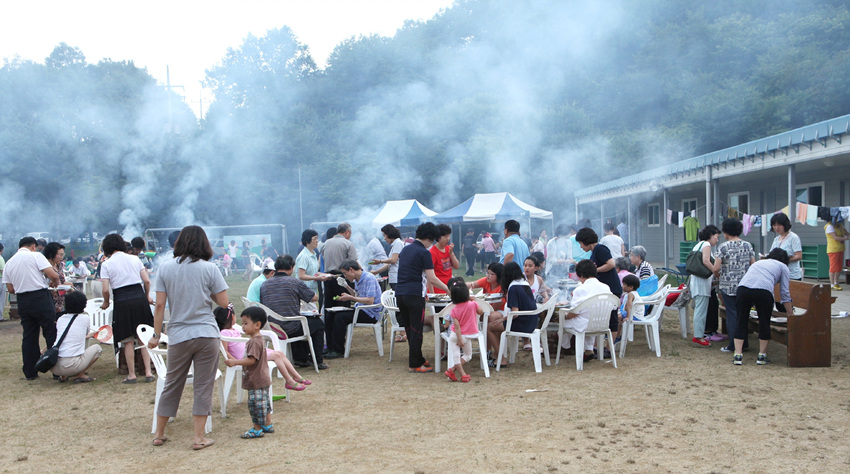 운동장에 둘러서서 나눈 바베튜 파티....