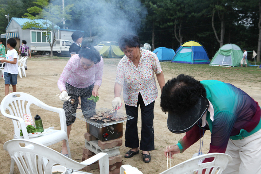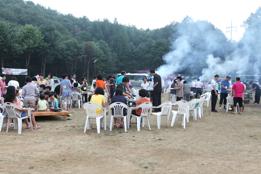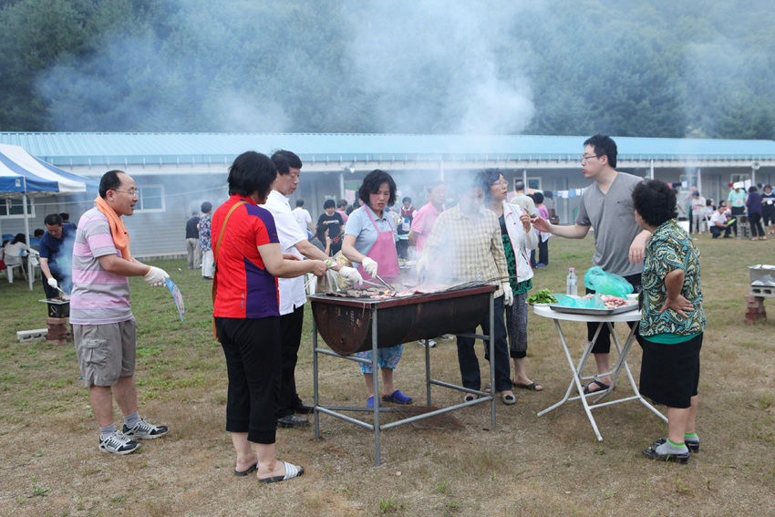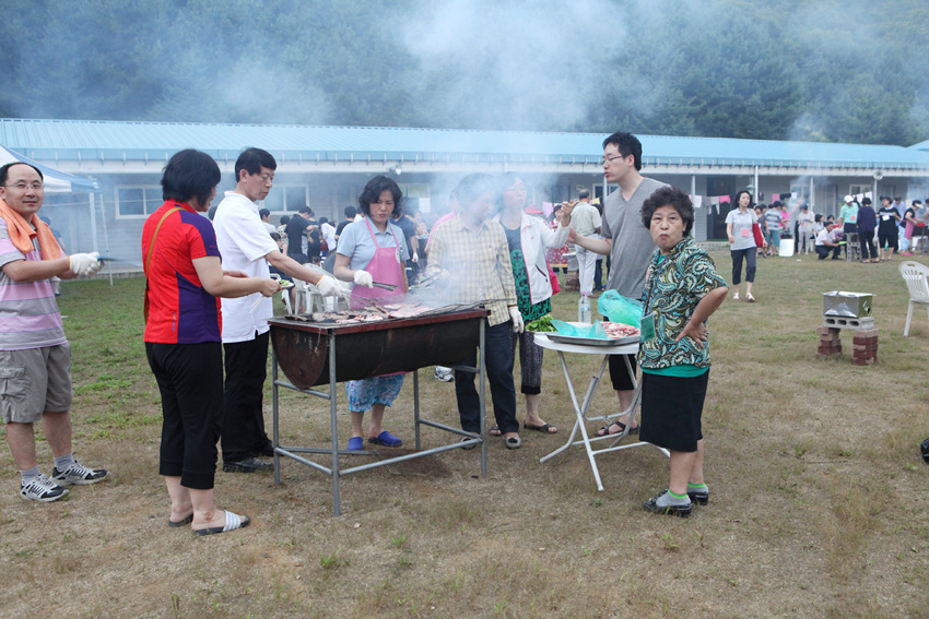 운동장에 둘러서서 나눈 바베튜 파티....